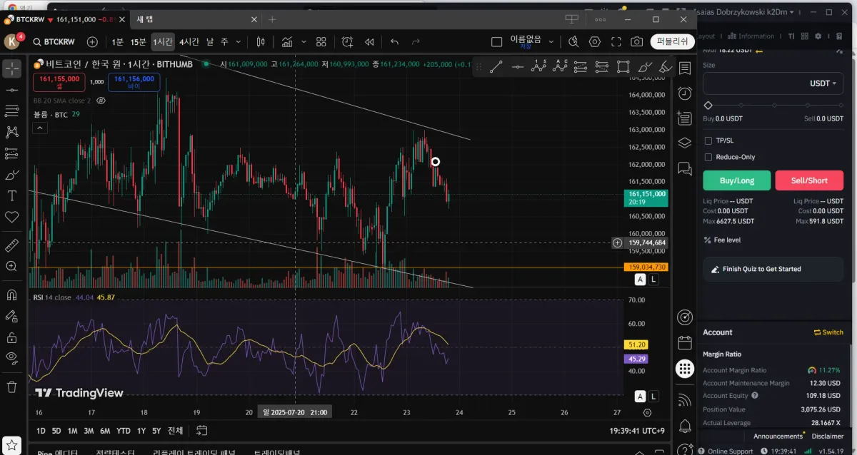 크게 본다는 느낌보다는 짧게 매매해보고자 우선 4시간봉을 보았습니다. (날봉에서는 수렴구간이라 판단하여서 입니다.) 그 다음에는 추세선을 그어보았고 저항 구간도 가로줄로 그어보았습니다. 보니까 딱 추세 박스권 안에서 왓다갔다 한다고 판단하였습니다. 그 다음 1시간 봉을 보니 박스권에서 이제 하락할 상황이겠거니 싶어서 숏을 진입해보았습니다. (동그라미 친부분입니다) 그 이후 한 6시간 뒤 확인해보니 약간의 수익을 얻을 수 있었습니다. 소액이여서 좀 큰 레버러지를 이용했습니다. 분봉 보고있다가 상승폭이 나오는고 있는 것 같아서 우선 8% 정도에서 마무리 하엿습니다.