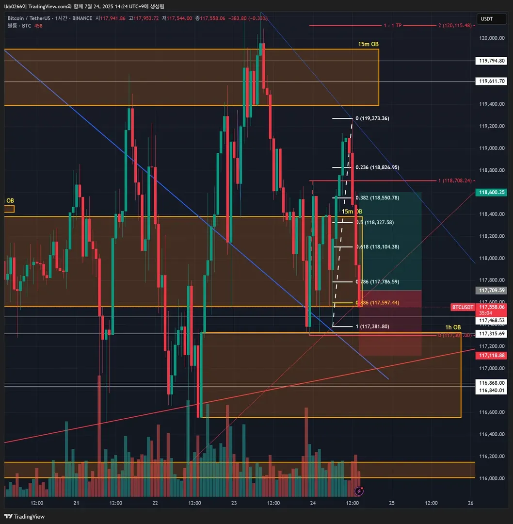 -하지만 0.886 자리기에 손익비가 좋다고 생각하고 15m OB에서 반등을 해줄 것이라고 예상함