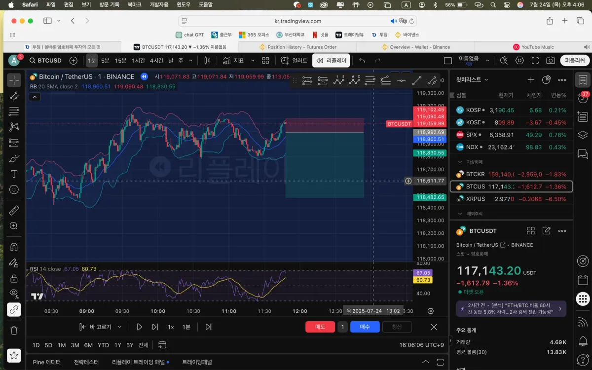 - 볼린저밴드 상단 터치 , RSI 과매수 구간 근접