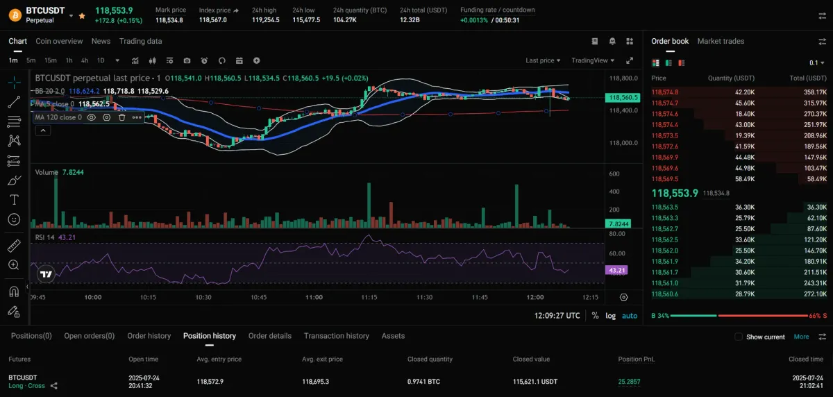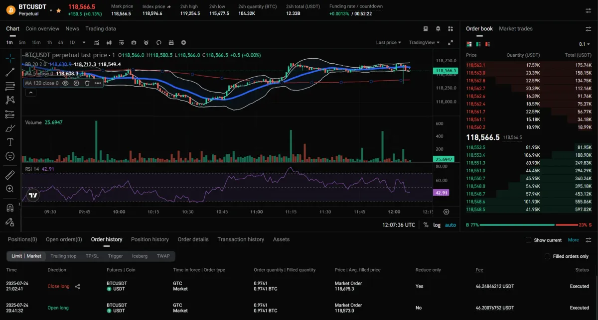 모의트레이딩으로 진행했으며 수익은 25달러입니다. 20분가량 거래를 진행하였고, 결과적으로 이익을 보았습니다. 다만, 고레버리지를 사용할수록 수수료가 높아지는 부분을 감안하여 잘 거래를 해야겠다는 생각이 다시 한 번 들게 되었습니다.