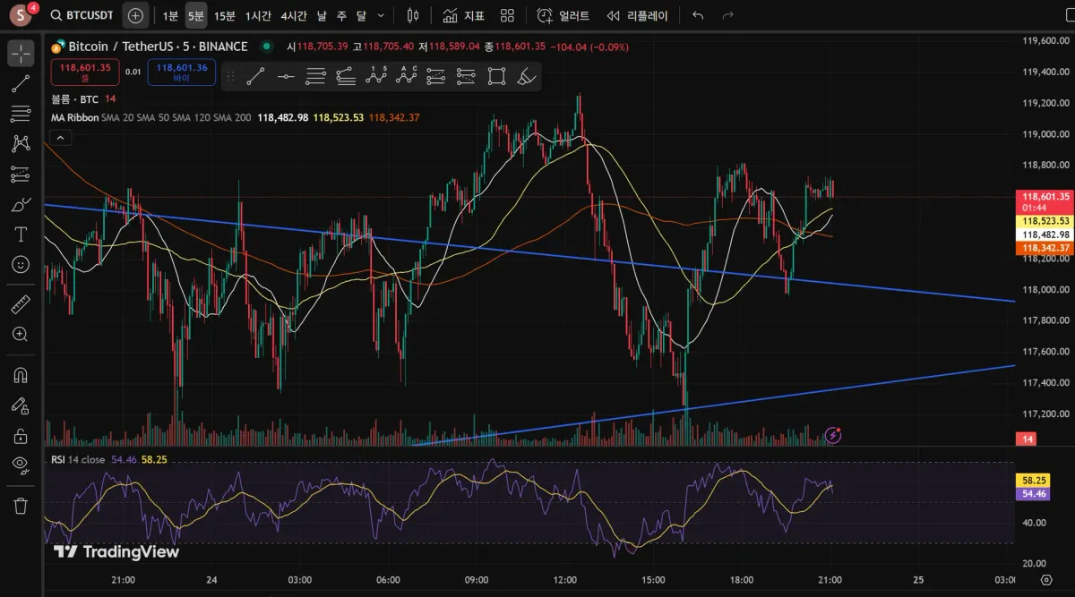 트레이딩 뷰와 비트겟으로 1분봉과 5분봉 겹쳐보며 확인하여 투자했습니다.
