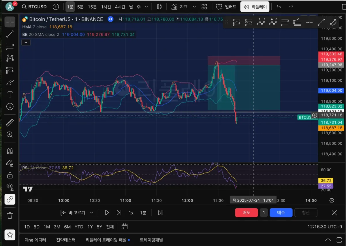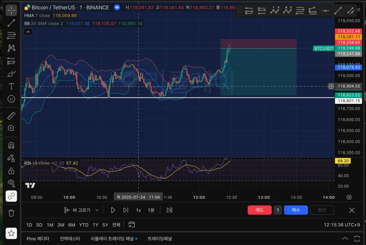 그런데도 이번에 그냥 진행한 건 RSI 값이 과매수 구간 중에서도 높은 구간까지 올라갔고, 볼린저 밴드 상단에서 쭉 밀기보단 상승 캔들의 길이감이 짧아진 게