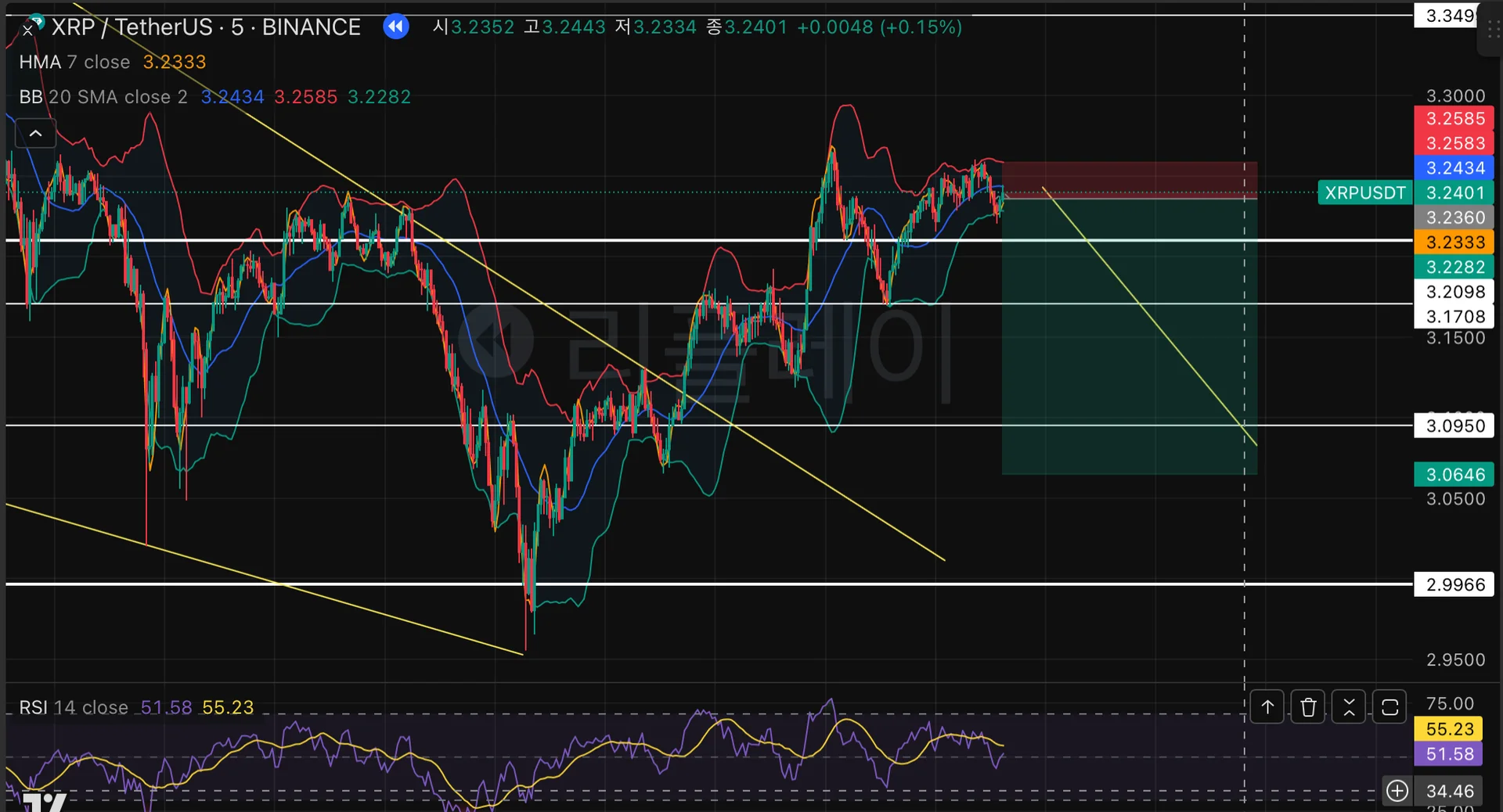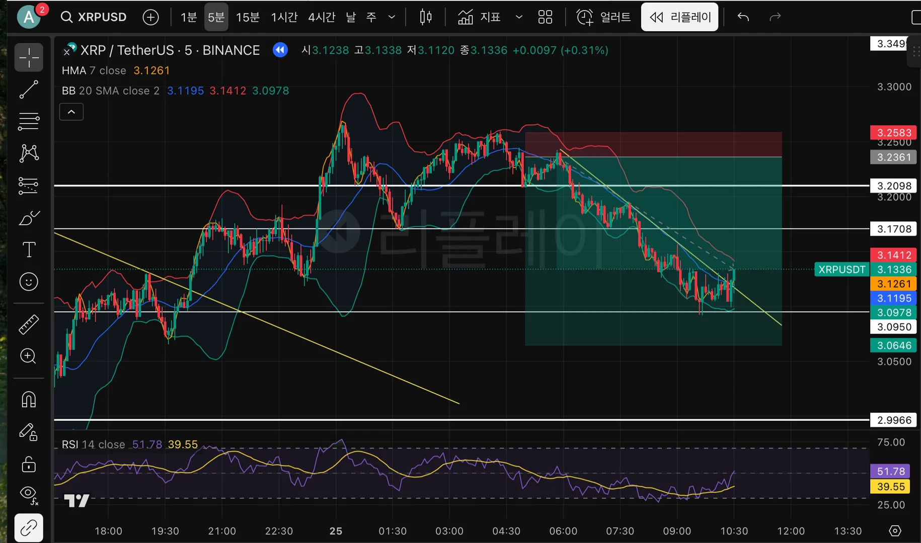 근데 비슷한 가격에서 하락한 RSI를보고 다이버전스정도로 생각했고, 고점이 낮아졌으므로 상승추세의 변곡이 발생했다고 판단했습니다.