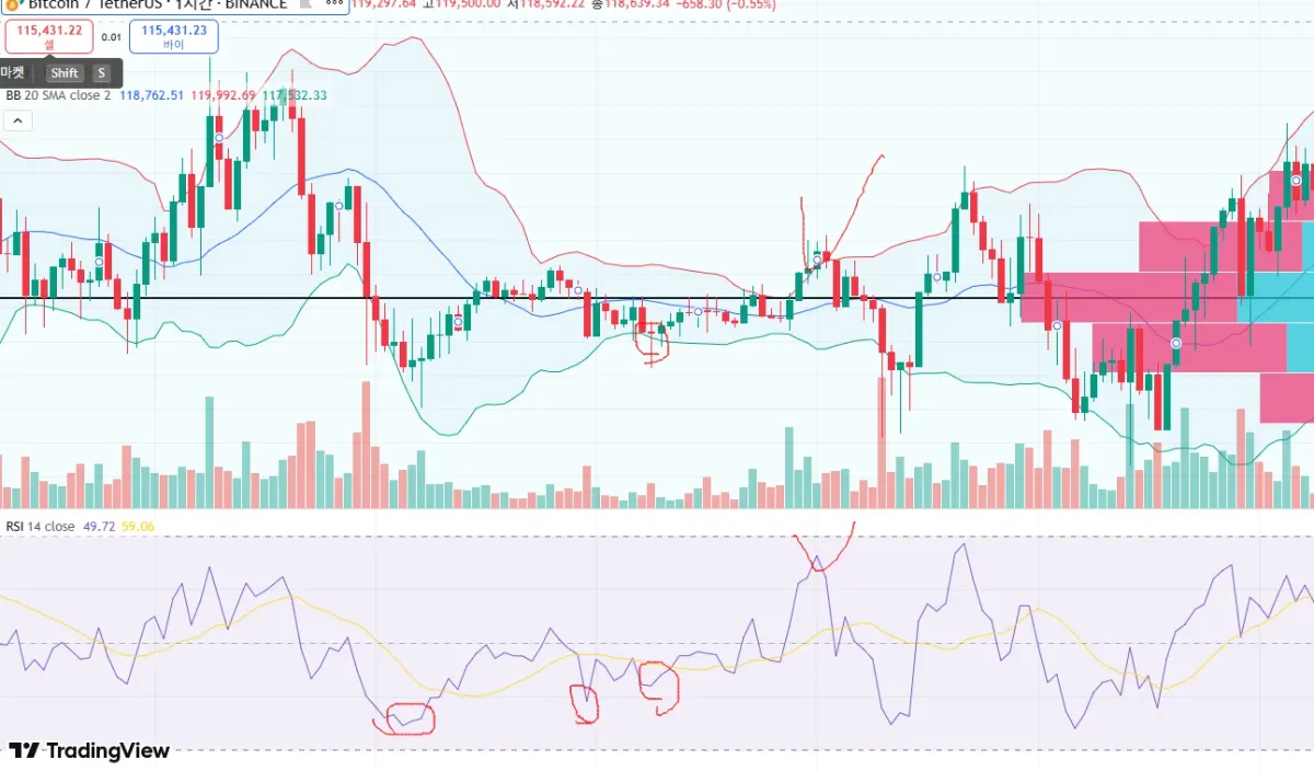 RSI 가 저점이 우상향하고 볼밴 하단 근처에서 매수후 그다음 볼밴 상당 V 표시부분에서 메도하는 전략이었습니다