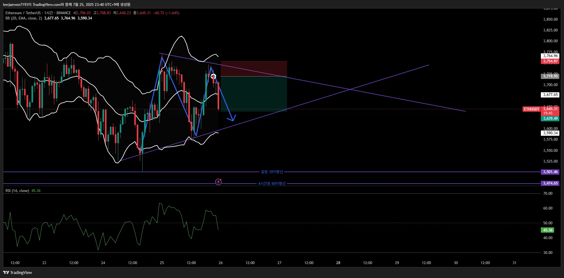 삼각수렴을 보고 4시간봉과 1시간봉의 차트의 볼린저 밴드가 비슷한 모양이며 삼각수렴의 저항선 계속 뚫지 못하고