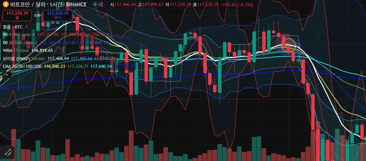 전고점 돌파하지못하고 소폭 하락중 윗꼬리가 긴 음봉이 연속으로 뜨고 긴 음봉발생하면서 이평선들도 하방가르키는걸 확인 음봉3개연속 떳을때 다음캔들에서 숏으로 진입 계속 홀딩했으면 큰수익 날수잇엇지만 긴장대음봉 출현후 조금되돌릴때 익절함