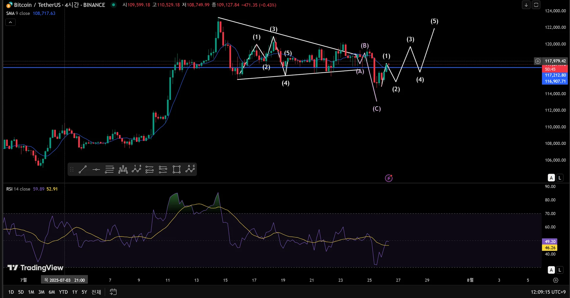 삼각수렴으로 26일에 발산할 것이라고 예상을 했고 그 후에 임펄스 파동을 예측하여 선을 그어봤습니다.