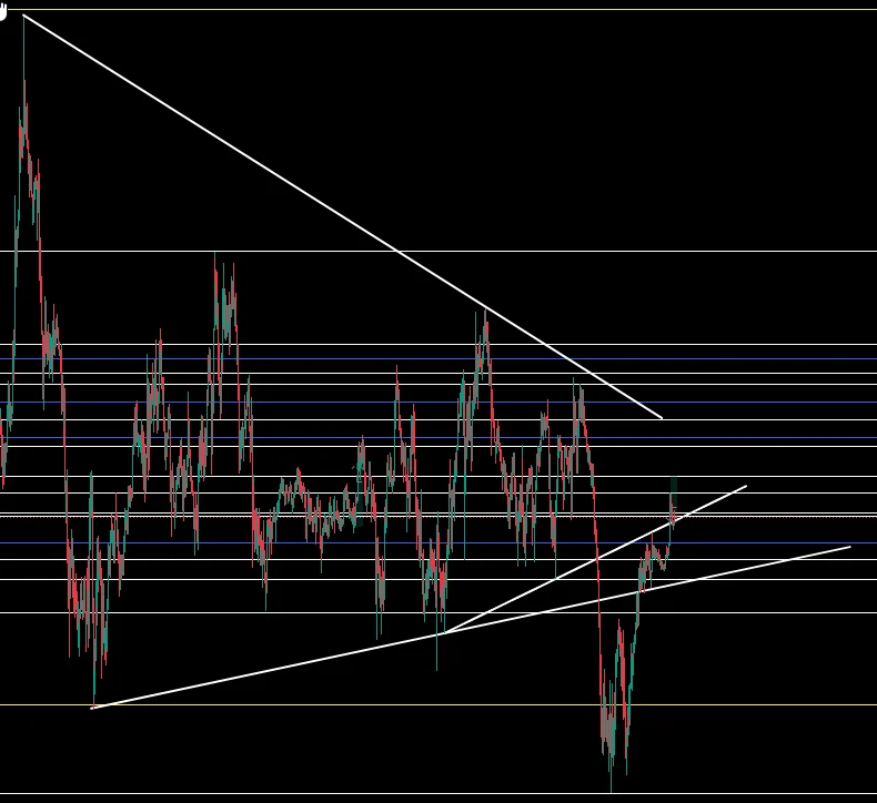 2차 추세선을 뚫고 올라가며 상승으로 바뀔 것이라 생각하고 지지선이라고 생각한 지점의 근처에서 롱을 잡았으나 저항을 맞고 떨어지면서 볼벤 중앙으로 내려가고 2차 추세선까지 내려가기에 손절함.