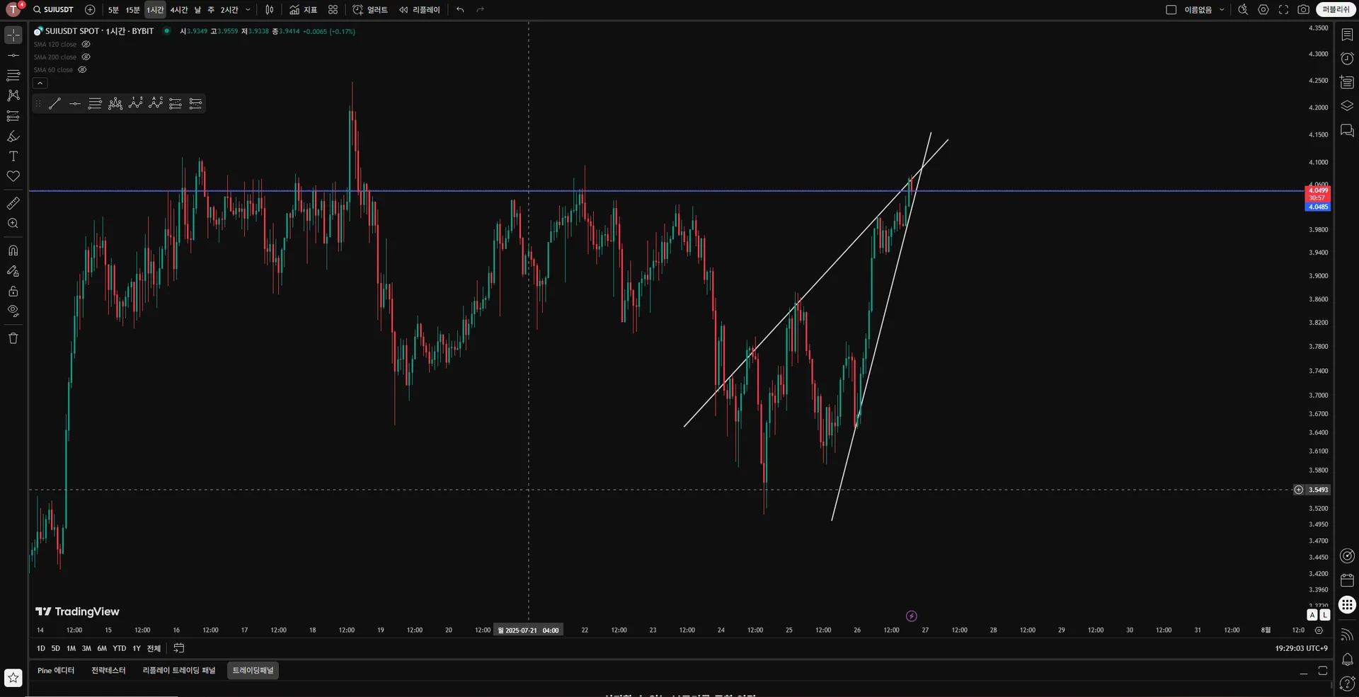 포지션 진입 근거 (“0729-1.PNG” 참조) : 우선 차트 분석은 1시간봉으로 시작하였음. 파란 선을 기준으로 7/28까지 코인 가격이 저항을 뚫지 못하고 있음을 확인할 수 있었음. 추가적으로 두 추세선(하얀색 선)들이 7/24~7/28까지 각각 지지와 저항의 역할을 할 수 있다고 생각하였고 그 계기로 진입을 생각하게 되었음.