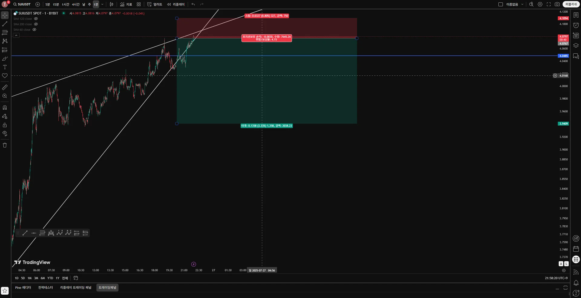 실제 매매 과정 : 사실 익절/손절 구간을 잡은 이후 바로 나는 매매를 하지 않았음. 왜냐하면 앞서 설정한 익절/손절 구간은 1시간봉에서 눈으로 봤을 그 당시의 실시간 가격(4.0767)을 바탕으로 대략적으로 잡아보았던 건데, 이를 1분봉으로 더 세밀하게 확인해보니 실제 비트코인 가격은 4.0407로 훨씬 낮았음 (“0729-2.PNG” 참조). 그래서 만약 기준점을 4.0767에서 현재가격 (4.0407)으로 낮추게 된다면 손익비가 급격히 좋아지지 않게 되서 (약 1.5:1) 고민 끝에 거래를 하지 않고 코인 가격이 내가 1시간 봉에서 기존에 어림잡아 잡았던 가격(4.0767)으로 올라갈 때까지 기다려보기로 했음.