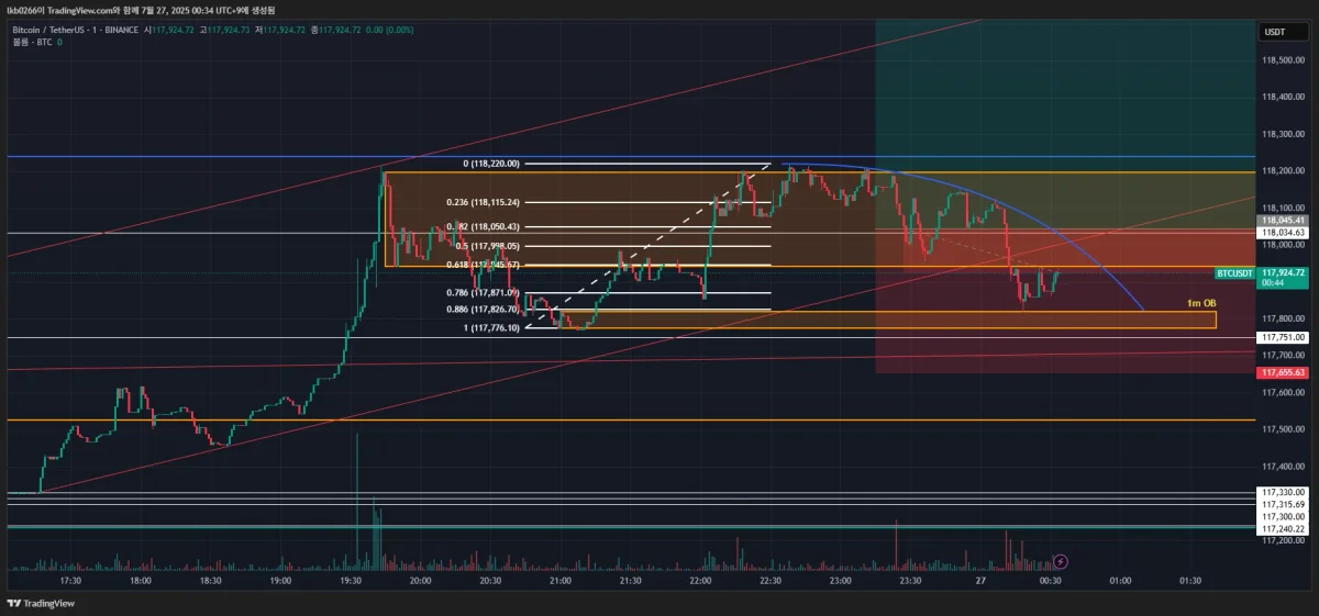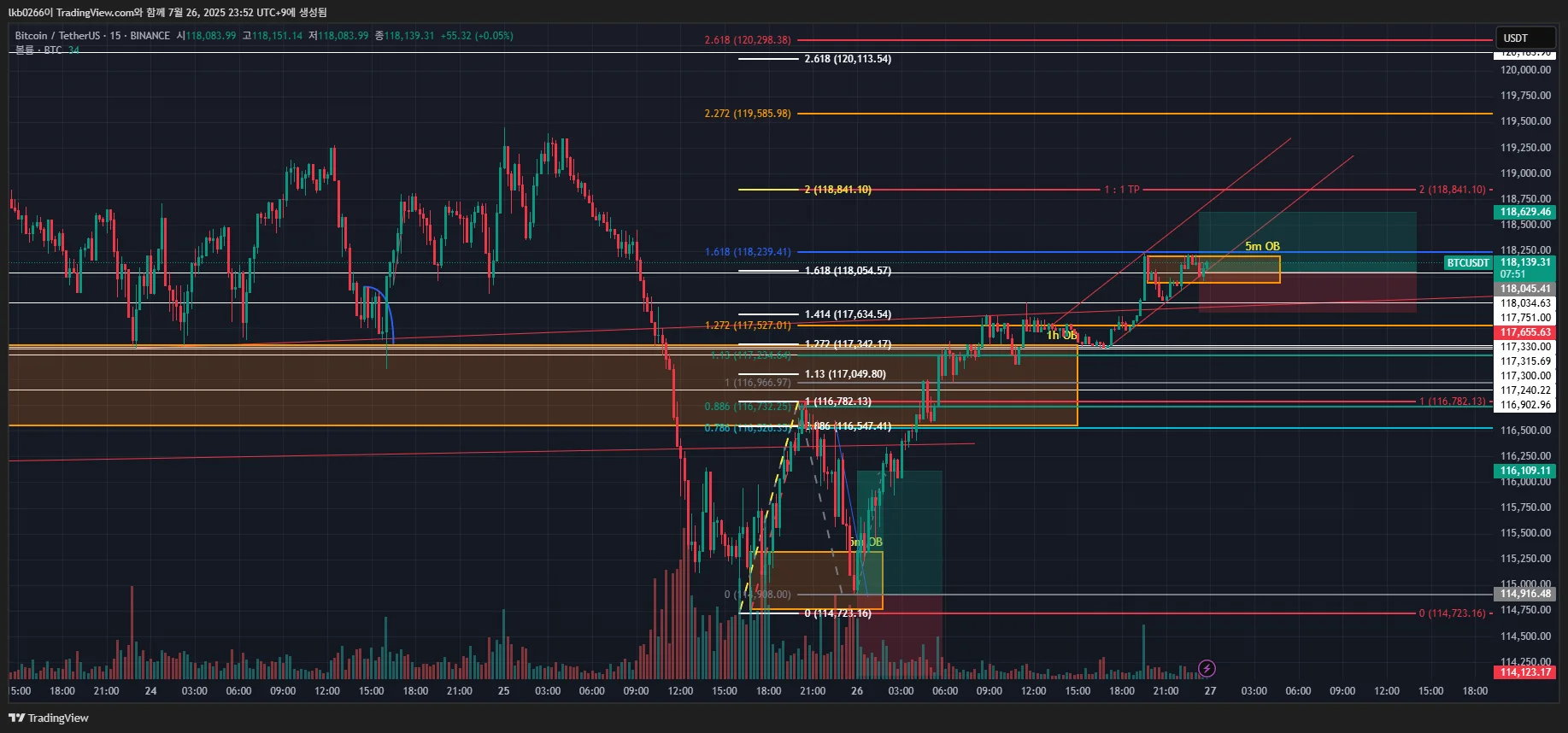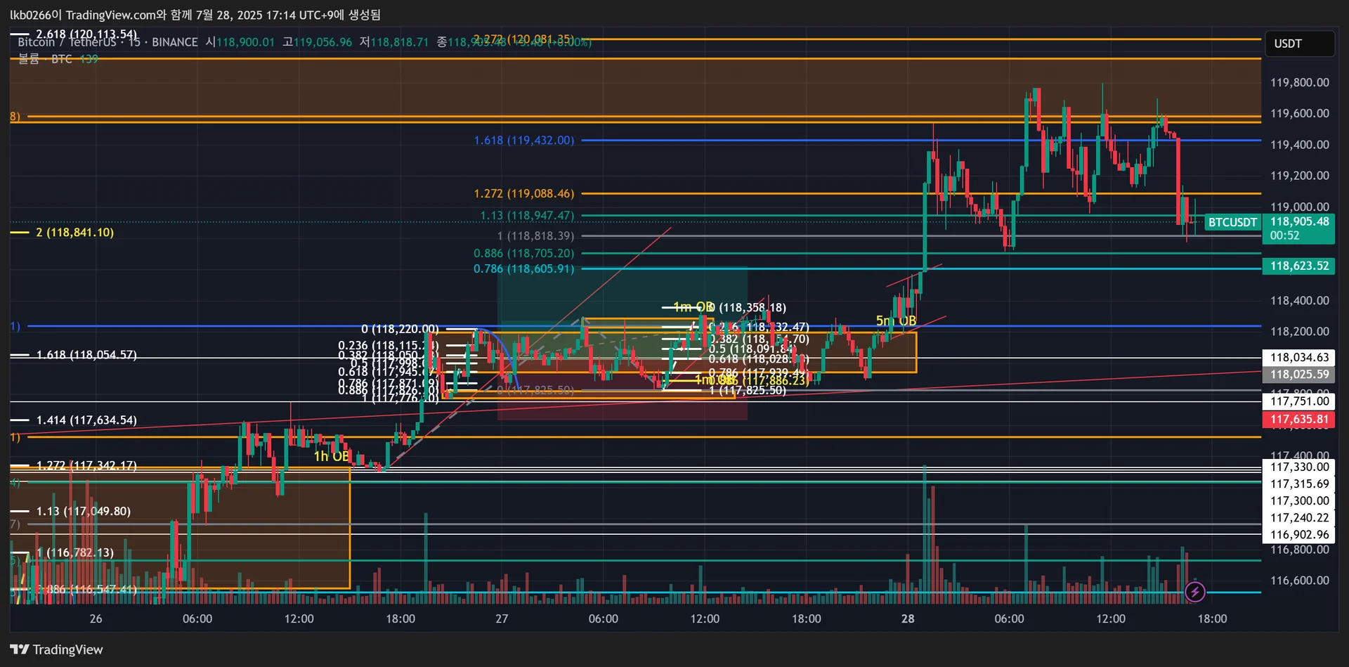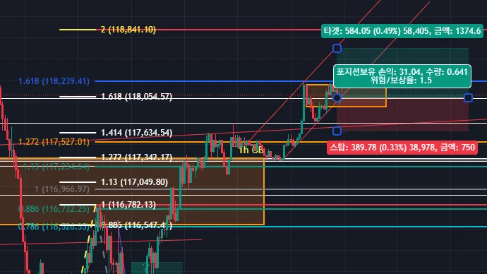 복기: OB 깨트리고 0.886 되돌림까지 나옴. 새로운 1m OB 생성 시키고 반등하였음.