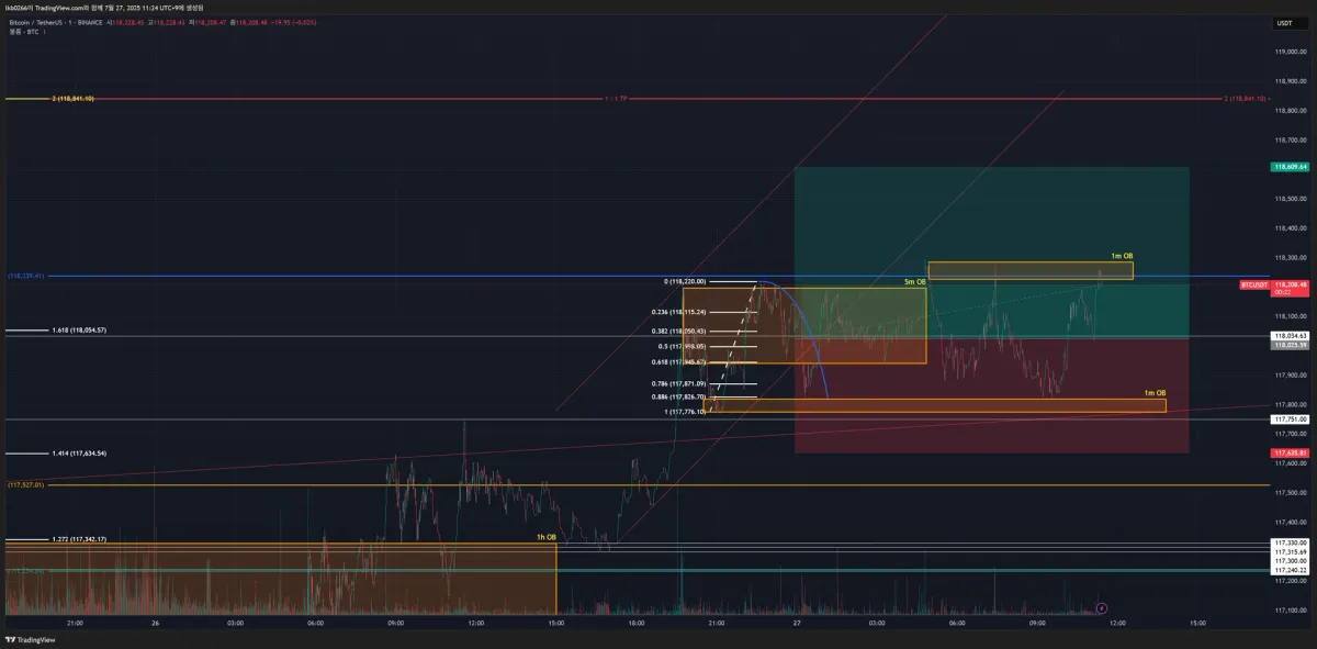 복기: OB 깨트리고 0.886 되돌림까지 나옴. 새로운 1m OB 생성 시키고 반등하였음.
