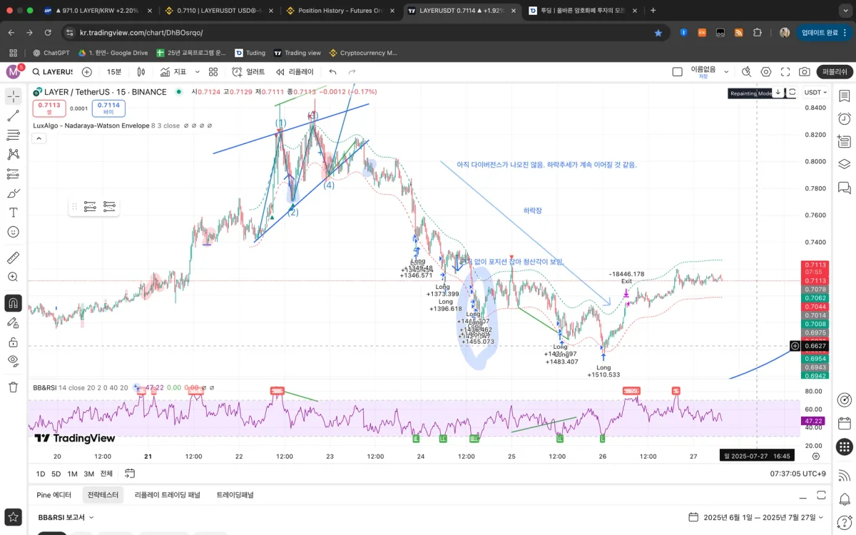 교육받은 내용을 토데로 선들 작도해서 참고하고, 매매하는데 있어서 도움이 될 만한 보조지표들을 차트에 대입해 가면서 찾던 중 Nadaraya-watson envelope 지표와 BB & RSI 돌파시 시그널 주는 지표 를 참고하여 매매를 진행하였습니다.