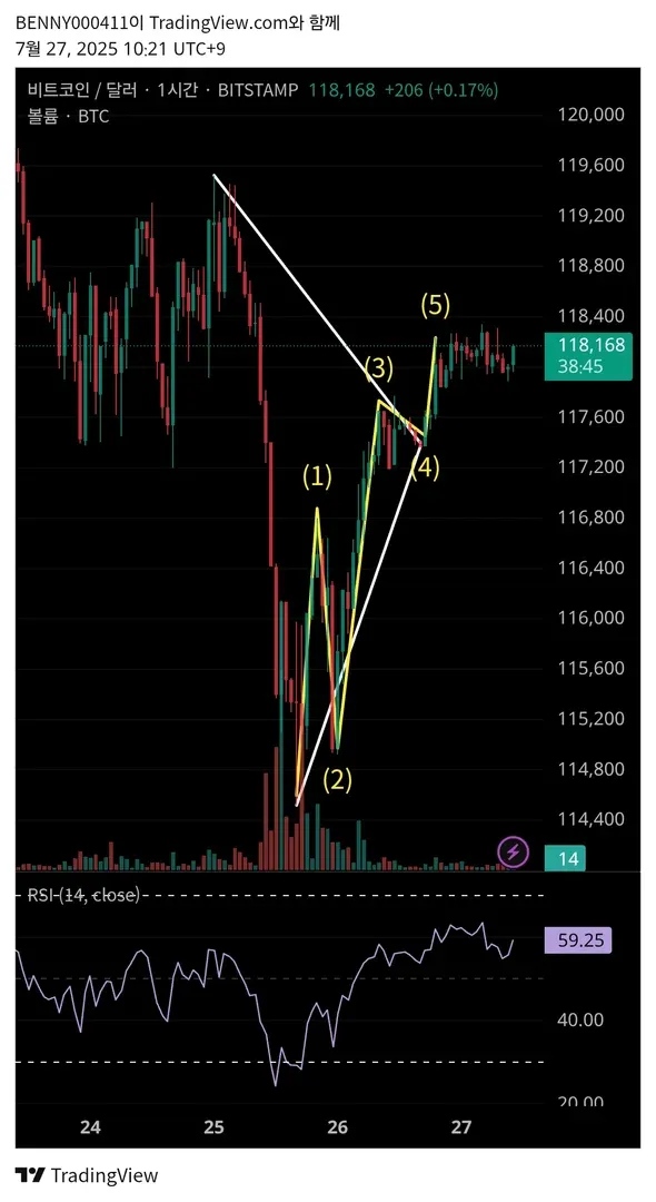 진입 시점에 임펄스 파동 - 3파>4파를 거쳐 5파 초입이라 생각해 매수함