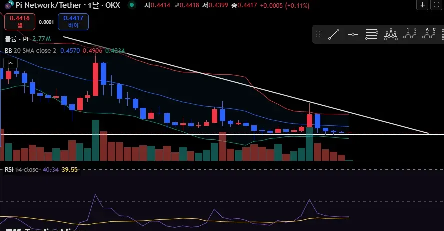 코인은 파이 코인입니다. 첫 거래를 시작해서 최고점을 찍고 나서 쭉 하락세를 유지하고 있는 중입니다