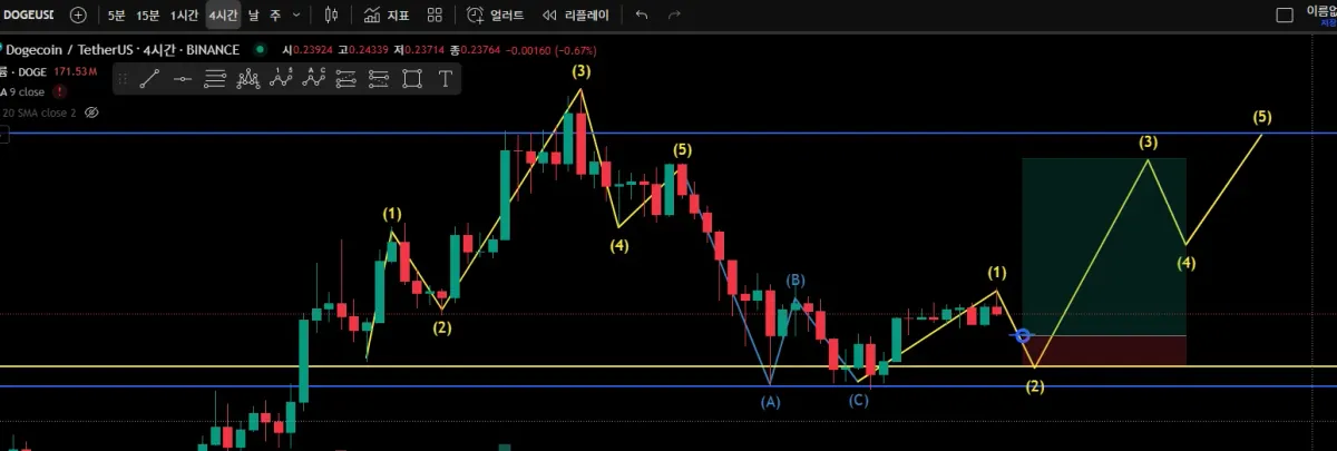 저는 도지코인(DOGE/USDT) 4시간봉 차트를 기반으로 엘리어트 파동 이론을 적용하여 가격 움직임을 분석하였습니다. 우선, 과거의 상승파동 (1)-(5)와 하락 조정파 (A)-(B)-(C)를 각각 노란색과 파란색으로 구분하여 작도하였습니다. (A)-(B)-(C) 조정파가 마무리된 것으로 판단하고, 새로운 상승 추세(1)-(5) 파동의 시작을 예상하여 매수 타이밍을 잡았습니다