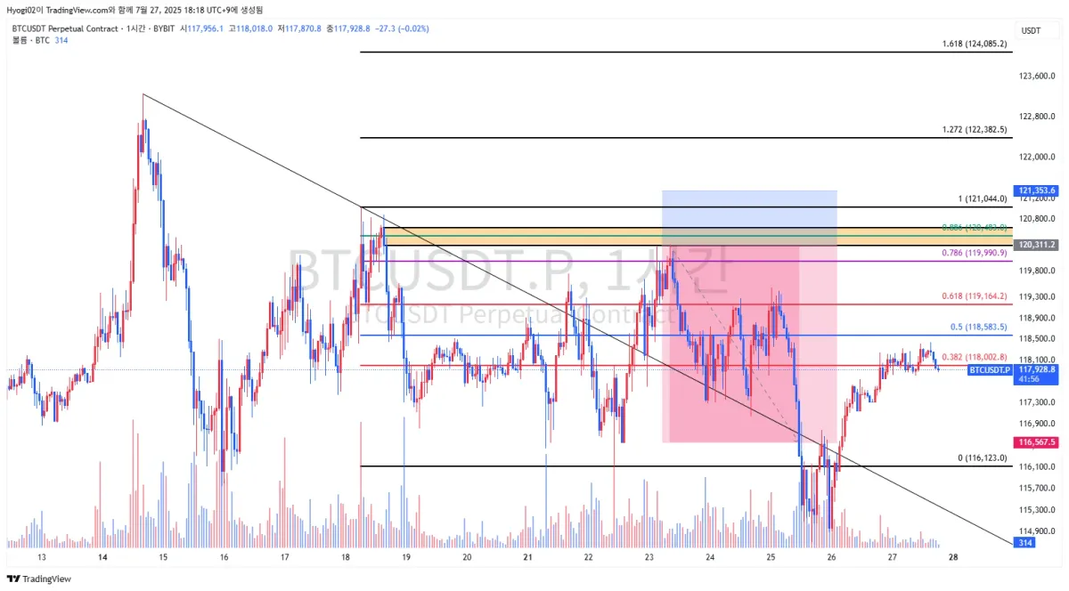 하락 중인 작은 프레임 추세를 상승으로 변모시키려는 움직임은 있었지만, 큰 추세에서 보면 고점을 깨지 못하였기 때문에 1시간 OB에서 저항을 맞을 것으로 판단했고 숏진입을 하였습니다.