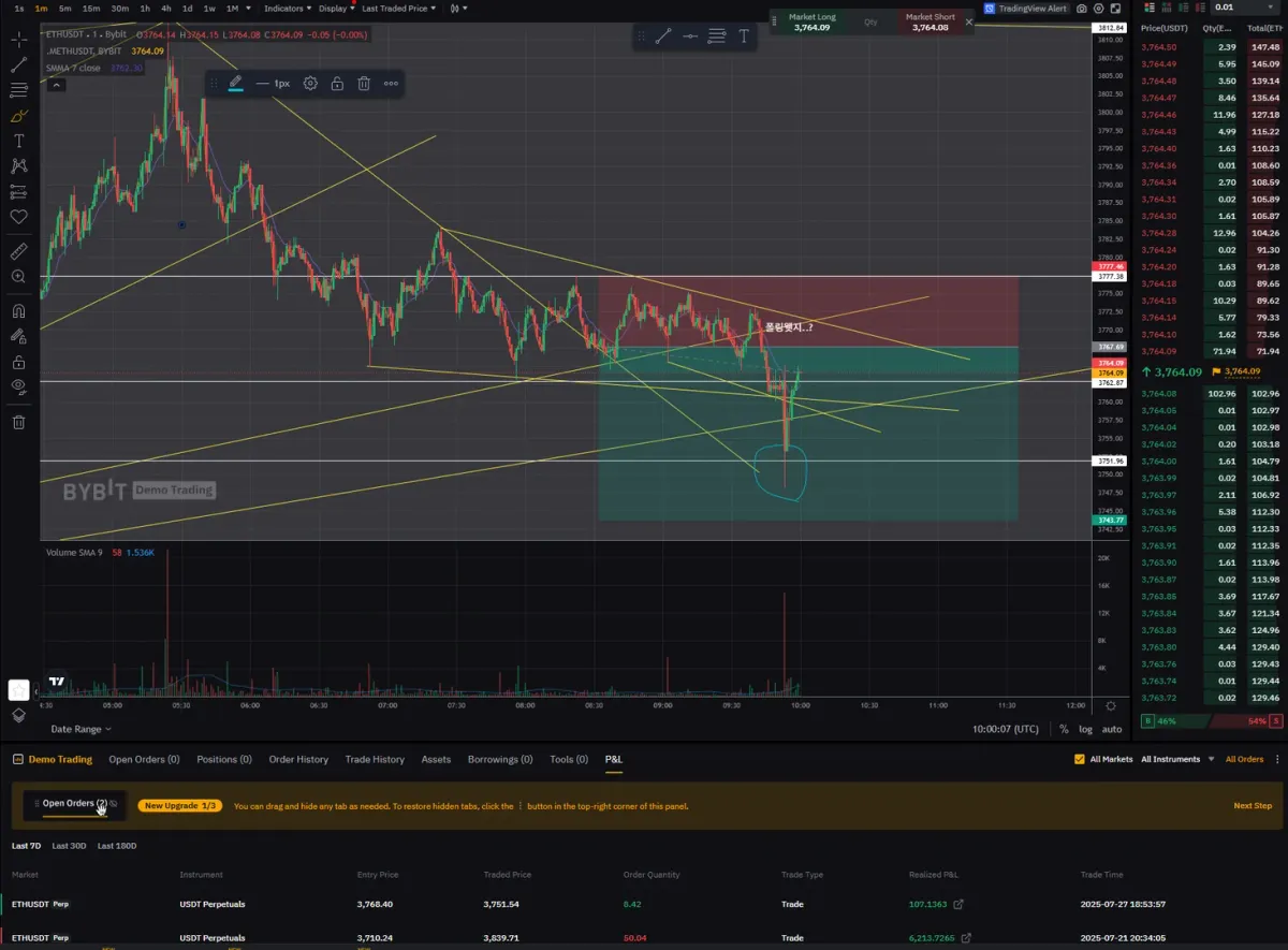4시간봉->1시간봉->30분봉->15분봉->1분봉 순으로 추세선과 지지/저항선을 설정하여 보았음
