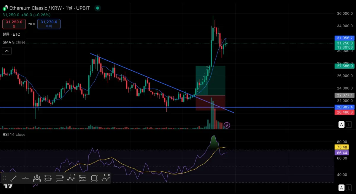이더리움 클래식을 계속해서 눈여겨보다가 매매를 하였었습니다. 그래프가 점차 수렴하고 있고 하락세가 거의 보이지 않아 오를거라고 판단하여 사선 그래프가 시작되는 지점에서 매수를 하였습니다.