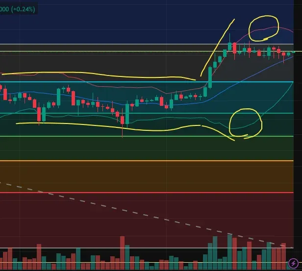 현재는 상단과 하단의 볼린저밴드의 폭에 큰 차이가 없어서 관망하며 기다릴 때인 것 같다고 생각합니다.