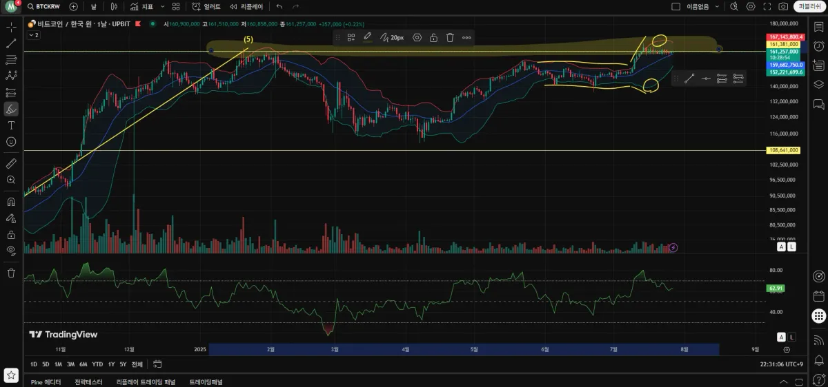 7월 9일부터 양봉이 위로 쭉 커지며 상승하기 시작했는데, 볼린저밴드로 상승추세에 변화가 있을 것이라는 예상을 할 수 있는 부분을 확인하였습니다.
