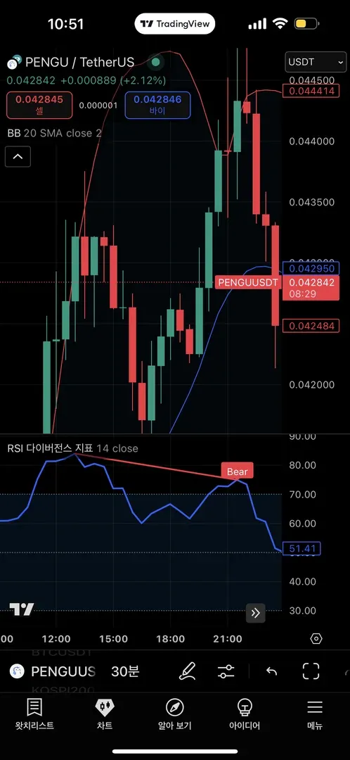 RSI하락!! 주가는 상승!!! 하락 다이버전스!!! 입니당