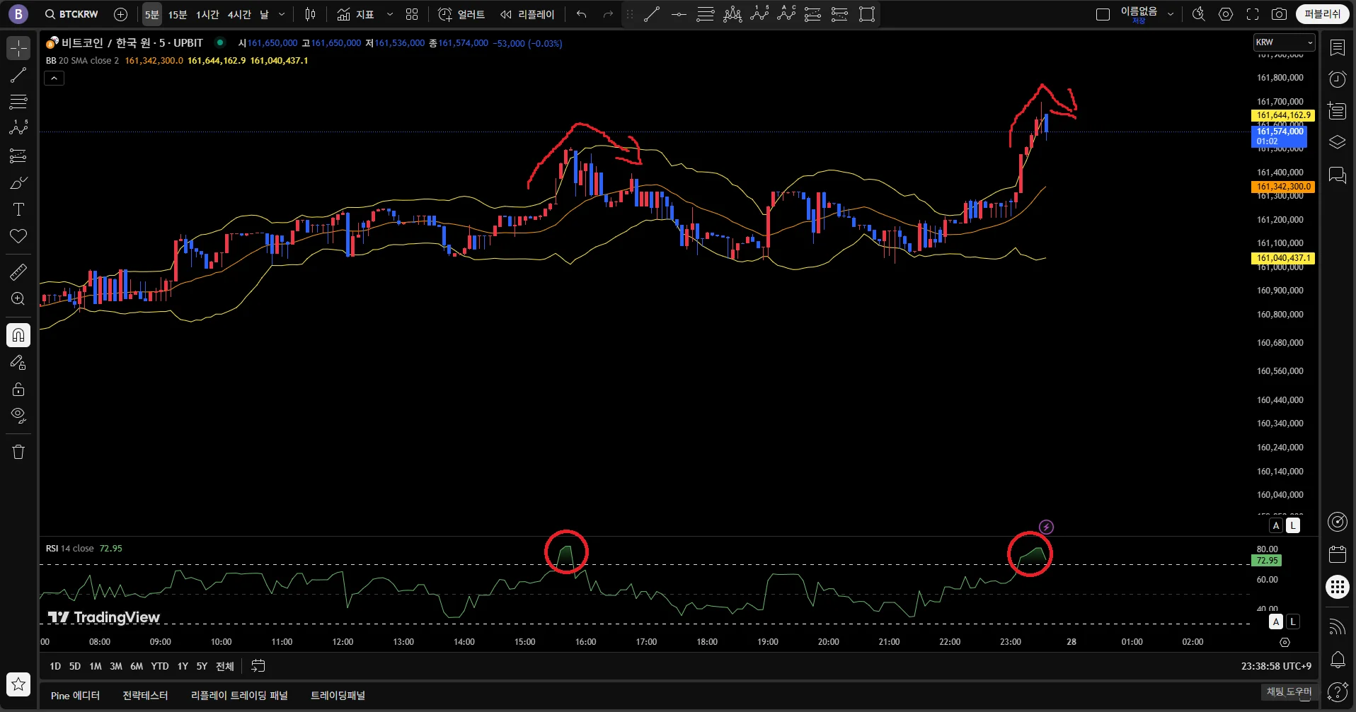 비트코인 5분봉입니다. 15시 40분쯤 RSI 82로 강한 매수세가 들어오면서 볼린저 밴드 상단까지 뚫었다 결국 매수세가 약해지면서 가격이 빠졌는데 지금 현재도 비슷하게 RSI 80 부근을 찍고, 볼린저 밴드 상단을 터치 후 하락할 것 같습니다.