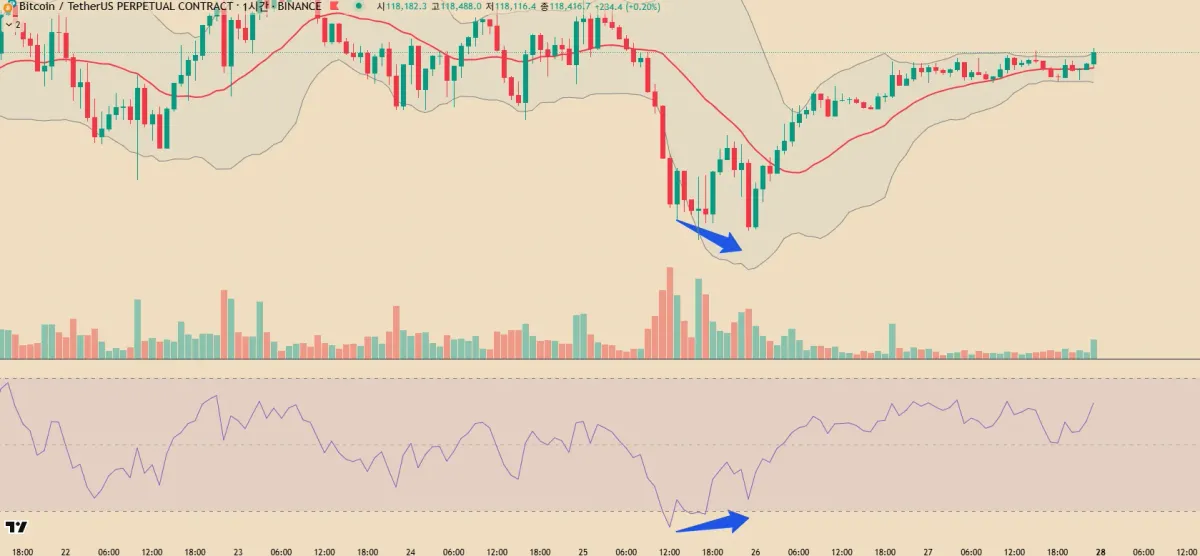 비트코인 1시간봉입니다. 매도세가 강하게 들어와서 볼밴 하단을 뚫었다 결국 약해지면서 하락폭이 줄어들다가 2번 상승다이버에 걸려서 상승을 했습니다.