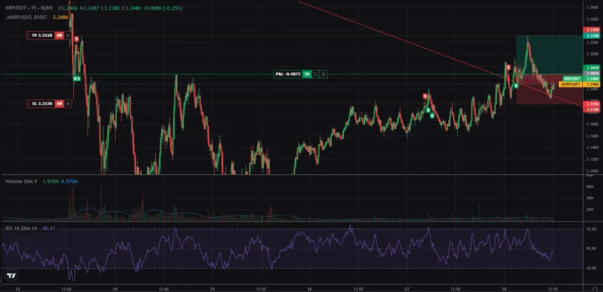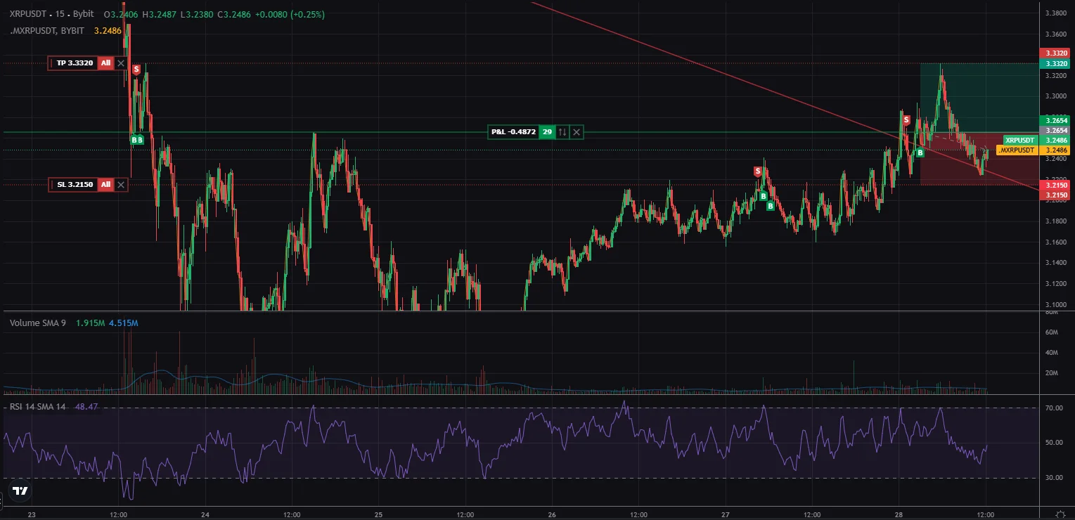 - 4시간 봉 하락 추세선을 거래량이 받쳐주는 양봉으로 돌파 후 리테스트 반응을 확인.