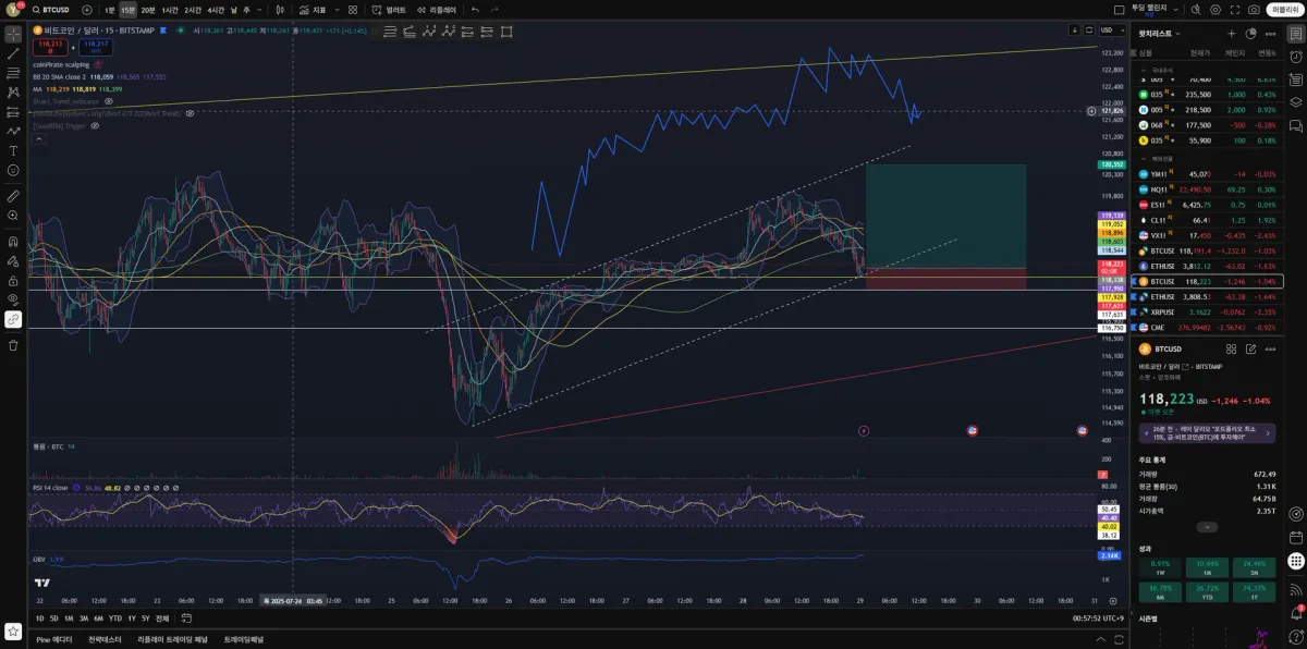 - 15분 봉 기준으로 봤을 때도 현재 상승 추세 안에 있고, 상승 추세의 하단선에 닿고 반등을 하는 중