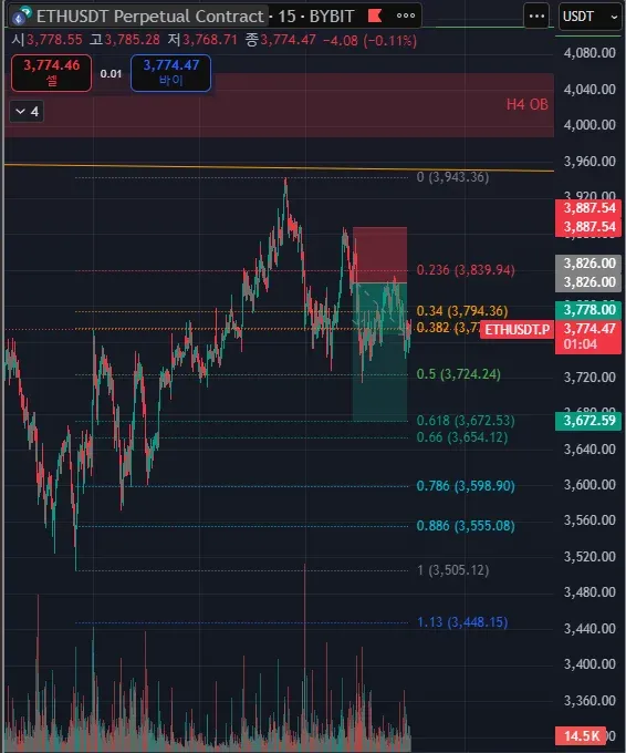 이전 고점을 갱신하지 못하고 꼬리저항을 확인하고 추격으로 숏 포지션 진입하였습니다.