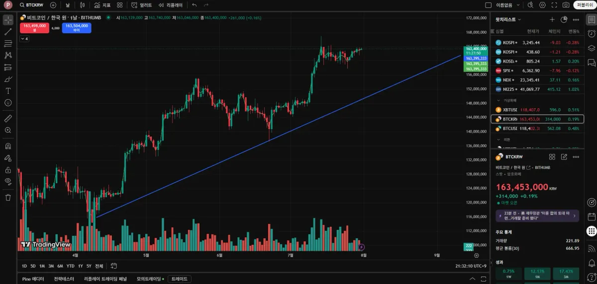 이렇게 하는것이 맞는지는 모르겠습니다만 추세선을 상승장의 밑꼬리 부분을 연결하여 그어보았습니다