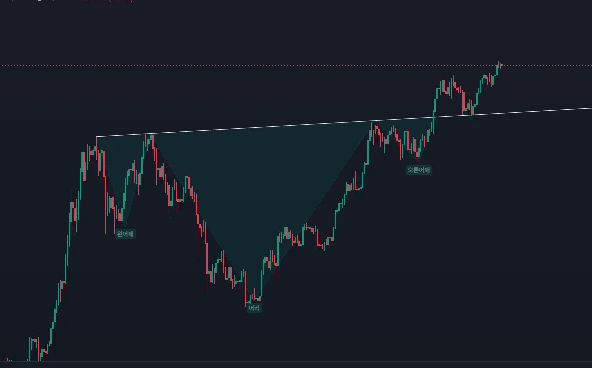주봉으로 보았을 때 패턴으로는 역헤드앤숄더가 관찰되고, 넥라인을 돌파한 후 저항이 지지로 바뀐 것을 관찰할 수 있습니다