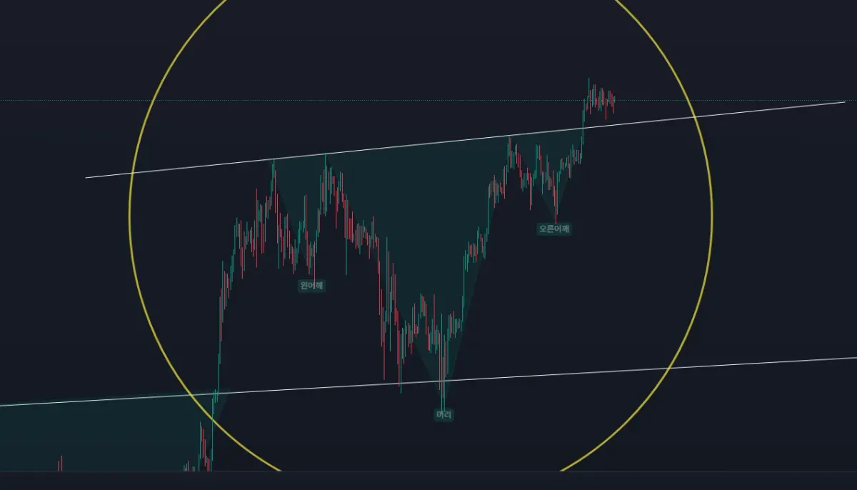 앞서 주봉으로 보았을 때와 같이 역헤드앤숄더 패턴이 관찰되며, 저항라인을 돌파한 후 지지로 바뀐 모습이 보입니다. 주봉과 날봉의 모습이 같은 프랙탈도 관찰됩니다.
