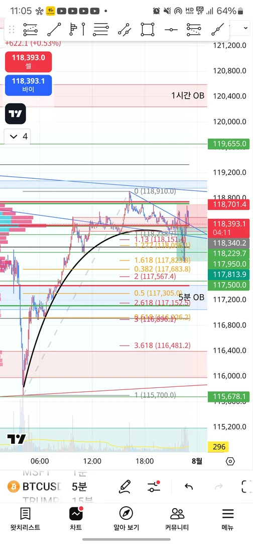 3) FRVP로 4시간 15분 5분 셋팅하고 박스권 내에서 POC(가장 강한 매물대)라인이 박스권 상단과 근접해서 숏 손익비 괜찮은 자리로 판단