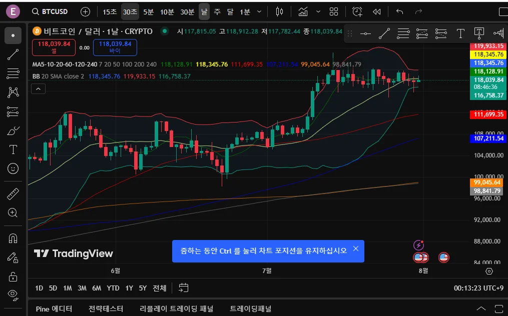 비트코인 1일 캔들보고 볼린저 밴드 보고 생각 해본게 볼린저 상단밴드를 찢은것으로 보아 상슬 할것으로 예상 합니다