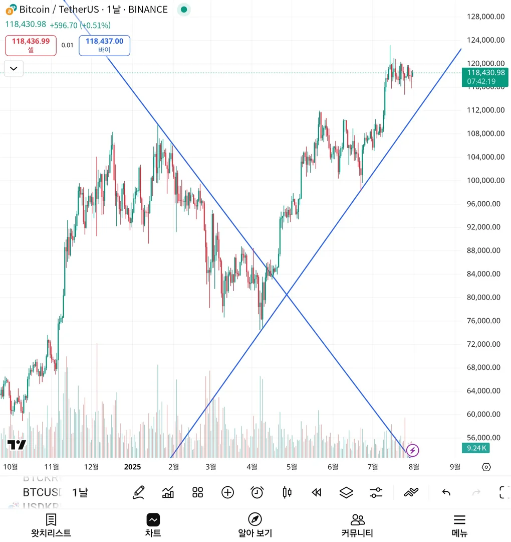 하락후 상승국면이었다가 지금은 과열국면에 접어든 것 같습니다. 거래량도 적은것이 유지되고 있고 뉴스들도 신고가 긍정적인 뉴스들로 도배가 된 걸 보니 과열이라 봐도 될 듯합니다. 몇일 뒤 상승추세선에 닿으면 한 번 정도 상승해주고 하락국면으로 접어들 갓으로 예상됩니다