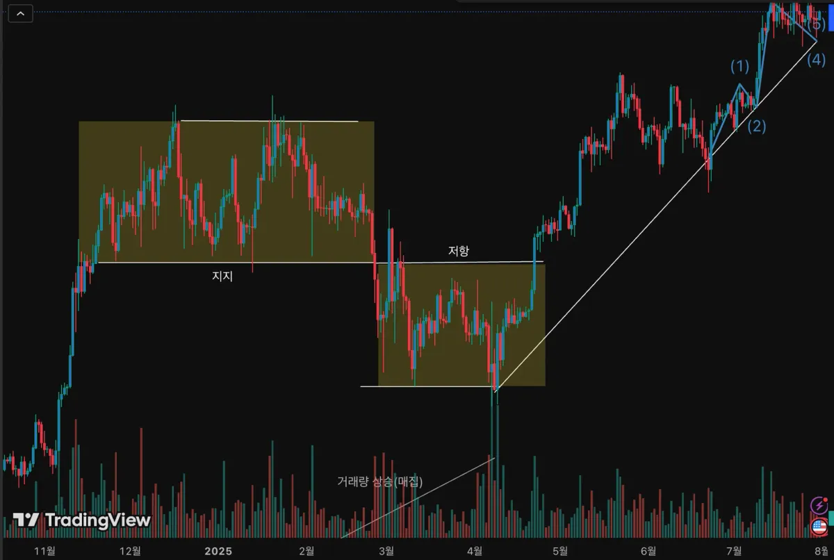 11월 중순부터 약 6개월 간 횡보 후 매집과 함께 상승 추세에 있는 것 같습니다. 최근 2주 간의 상승세가 약화된 것으로 보아 약간은 과열된 상태에서 물량 정리가 조금씩 이루어지고 있지 않나 예측해보았습니다.