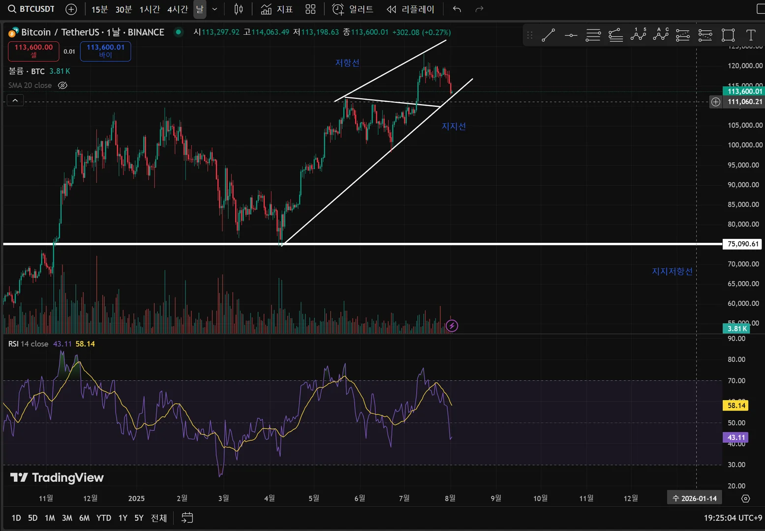 전체적으로 봤을 때 우상향 하고 있고 캔들이 지지선까지 하락 후 다시 반등할 것으로 예상하여 저라면 지지선 부근에서 매수하고 저항선 부근에서 매도하겠습니다