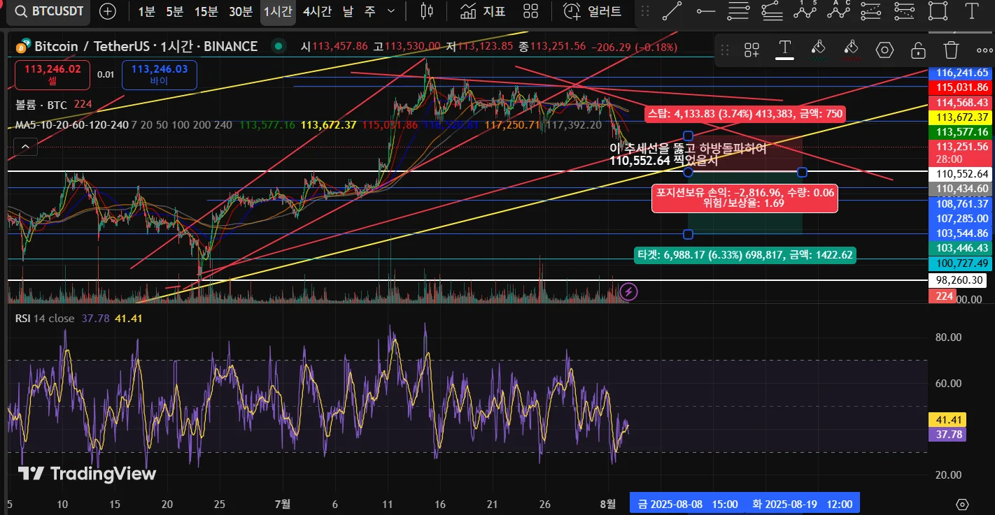 첫번째 하얀색 지지선은 일봉으로 봤을때의 지지선인데 이 지지선을 찍은후 리테스트하여 빨간색 상승 추세선을 찍고 하락할것으로 보이며, 하얀색 지지선을 뚫고 하방돌파하며 최소한은 체크해놓은 것처럼 103,544.86정도까지, 더 갈수도 있다고 생각은 하는데 2의 손익비 이지만 어느정도 맞다고 판단이 들어서 이렇게 체크함