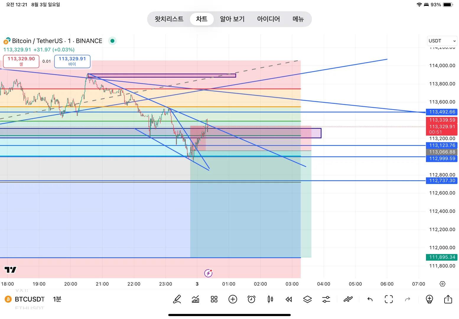 진입근거 : 4시간봉 1시간봉 모두 하락추세이고 1분봉의 하락추세의 매도세가 강하고 한번 튕구었던 오터블럭이 있다고 판단되었습니다 113,123.7 부근에서 지지 받을것이라 생각하고 포지션에 들어갔습니다