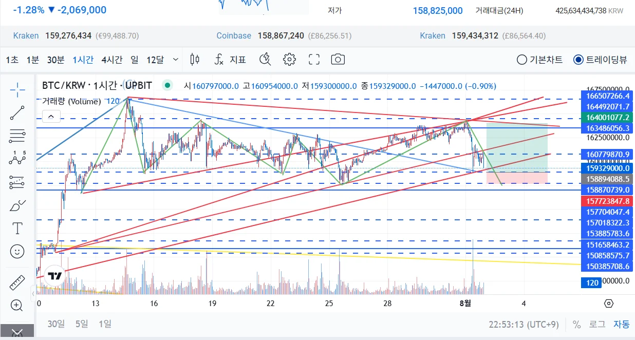 일봉 4시간봉에서 상승 추세를 보이고 있으며 1시간봉에서 단기간 하락 추세를 보이다 추세 변화가 온거같아 매수에 진입하였음