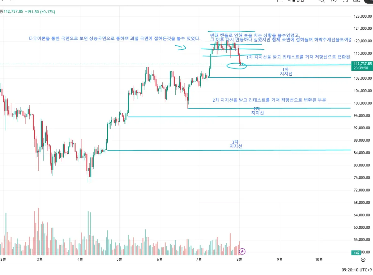 -이것은 현 25년도 8월3일 일요일기준 아침 9시30분 차트였습니다. 4월 중순부터 약 4개월 뒤인 8월을 부분으로 해석해 보았습니다.