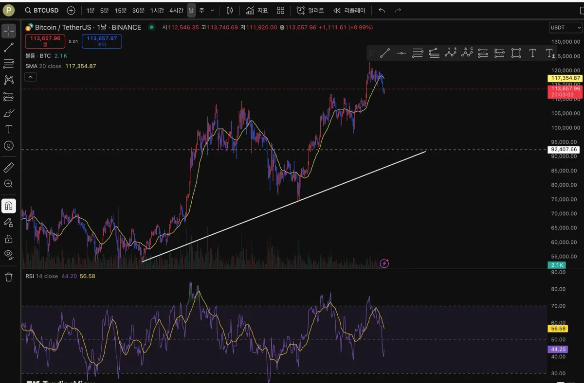 현재 하락하는 추세로 보이지만 상승 추세선에 따라 지지받아 상승할 것으로 보입니다..?