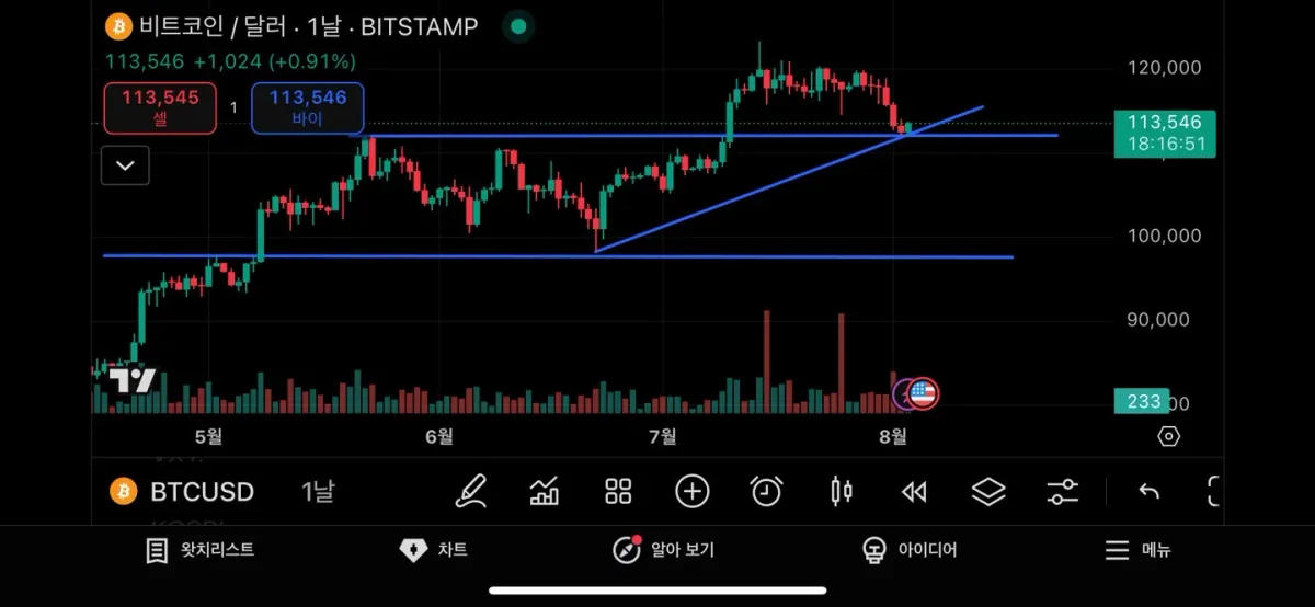 제 생각으로는 전 고점 지지선을 돌파하여 내려간다면 하락추세로 전환된다고 생각합니다