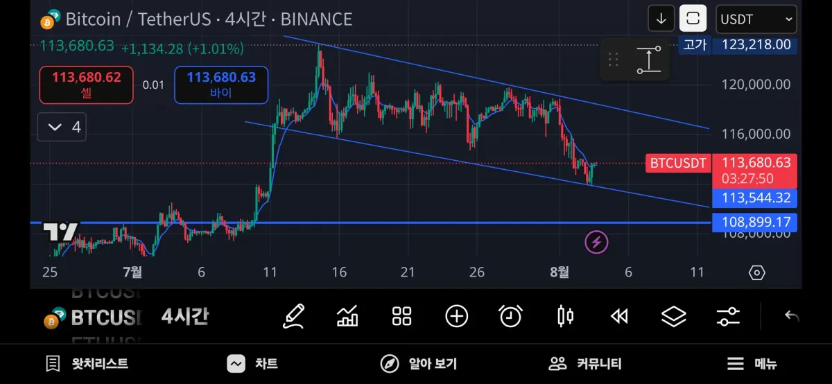 4시간봉 작도입니다. 중단기 하락세일걸로 보이며, 장기적으로 11만 선을 지켜준다면 국제정세와 경제상황에 큰 사건이 없다면 상승세를 유지 할 것으로 예상됩니다.