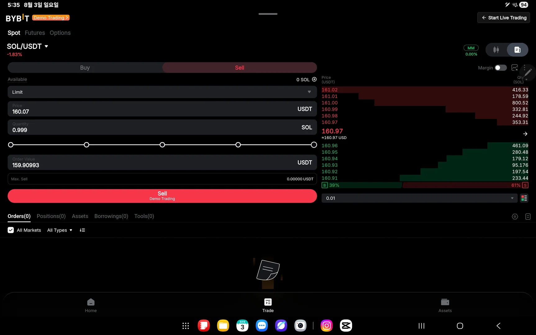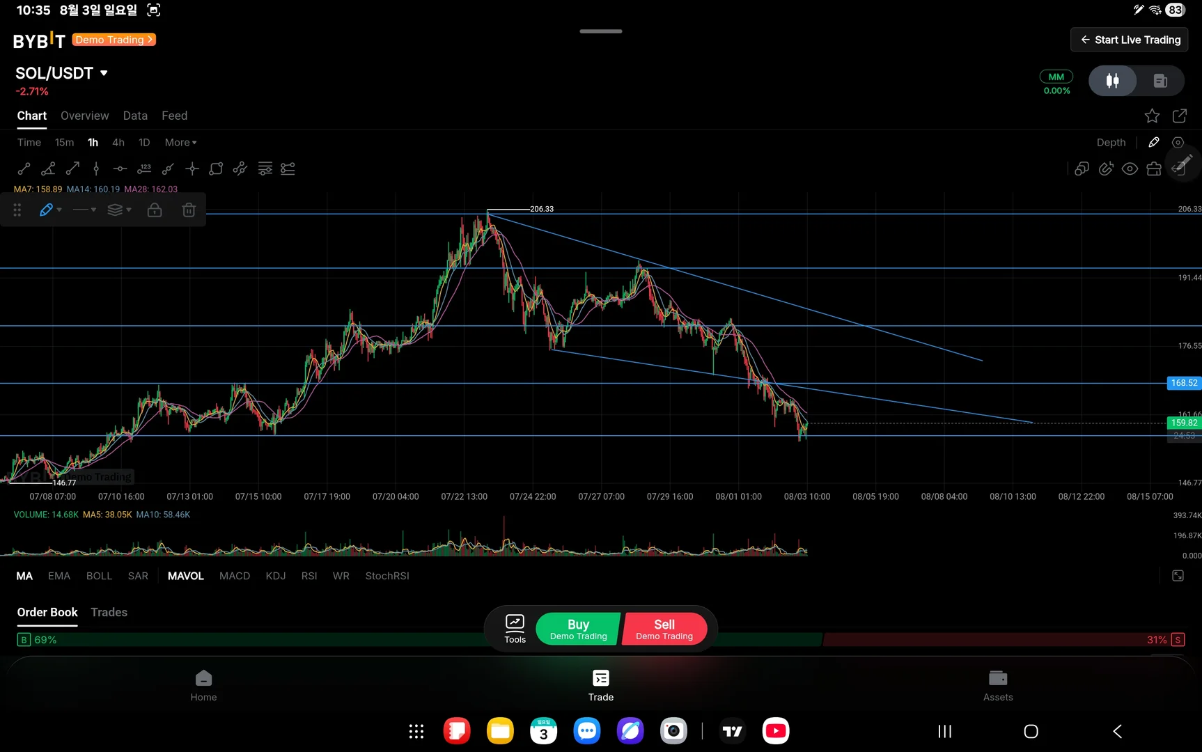160SOL에서 진입을 하였으며, 이득은 몰라도 손해는 보지 말자는 마인드로 159.82에 그어진 지지선을 뚫었을 때 물량을 정리하자고 생각해 트레이딩을 진행했어요.