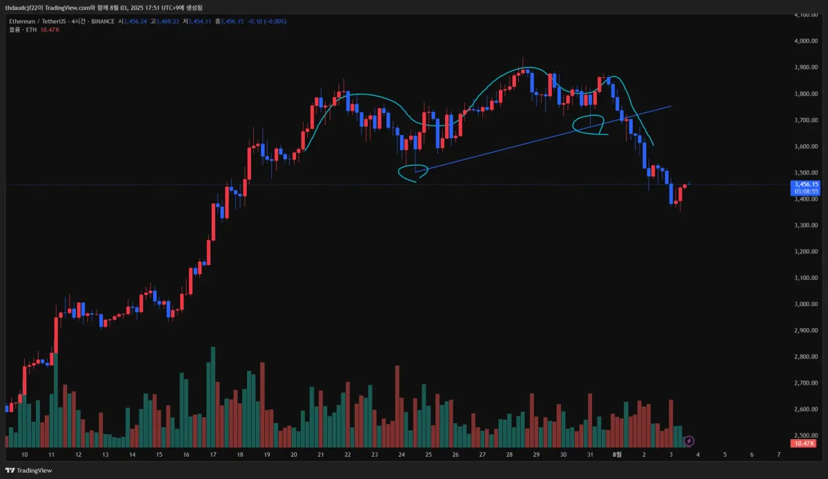 헤드앤숄더 패턴으로 생각하고 밑에 두개의 변곡점을 잡고 작도를 해봤습니다. 많이 부족하지만 열심히 해보겠습니다! 생각보다 재밌네요ㅎㅎ