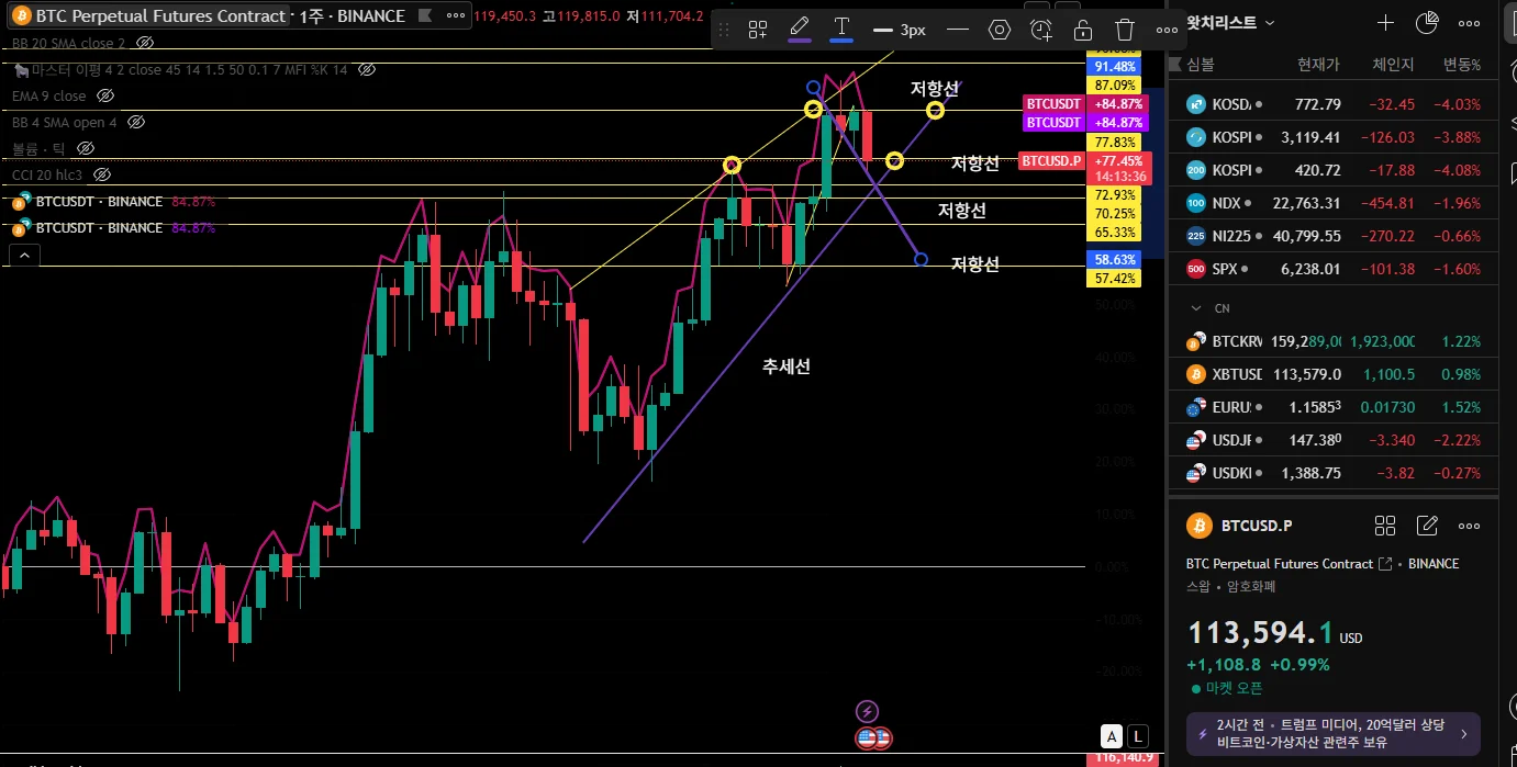 추세선 4월부터 급격한 상승후 , 조정중입니다. 95K에서 100K까지 조정 가능성있슴