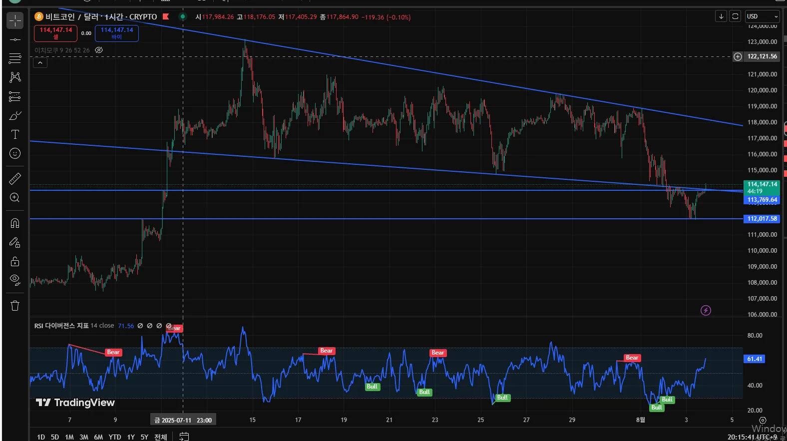 1차 상승이 나온 곳에 2차 저항, 2차 상승이 나온 곳에 1차 저항을 그었고, 하락추세선을 저점과 고점들을 연결하여 하락 채널을 만들었습니다. 하락추세 하단선과 1차 저항을 돌파하여 하락한 이후 2차 저항선에 맞고 반등한 모습을 보였고, 이후 1차 저항선과 하락 추세 하단선을 동시에 돌파하여 하락 채널 안으로 들어온 모습을 보였으니 상승이 이어진다면 그 다음 매물대가 있는 116000까지 상승, 더 크게 잡는다면 하락 추세 상단선까지 상승할 가능성이 있으며, 안정적인 매매를 추구한다면 116000과 117000, 118000에서 세 번에 나눠 숏 포지션을 분할로 잡아볼 수 있으며 공격적으로 매매한다면 추세선 돌파에 따라 롱 포지션을 잡고 분할로 매도한 뒤 숏 포지션 전환을 추구할 수 도 있을 것 같습니다.
